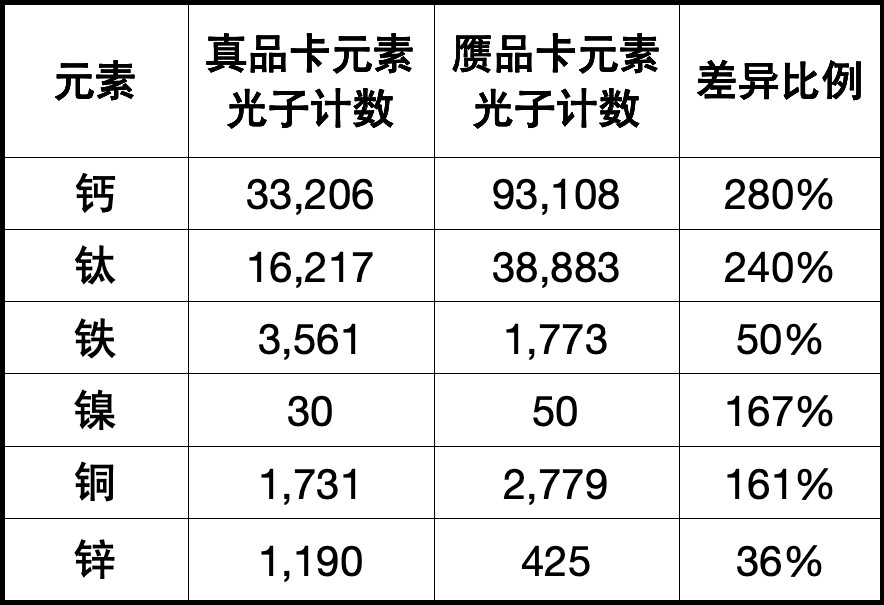 CGC卡牌评级团队还对这些卡牌进行了X射线荧光光谱(XRF)分析。结果显示,赝品卡所用油墨与纸张的化学成分与CGC迄今检测过的所有真品《宝可梦》卡牌均存在显著差异。例如,喷火龙赝品卡中的钙元素含量几乎达到真品卡的三倍,而锌元素含量仅为真品卡的三分之一。赝品卡中其他元素的比例也存在异常,具体数据详见上方图表。